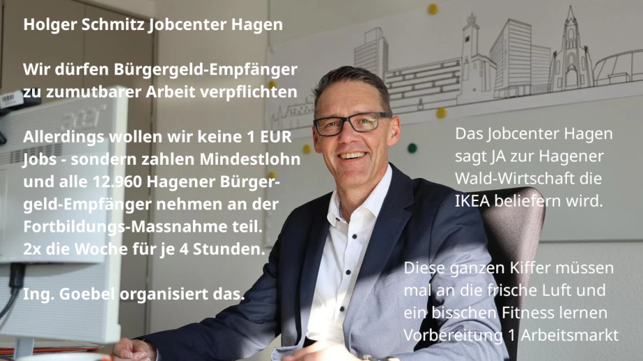 >>> Holger Schmitz vom Jobcenter Hagen - Wir bringen eine Armee von 12.960 Bürgergeld-Empfängern an die frische Luft, in die Hagener Wald-Wirtschaft - Jeder / Jede muss 2x die Woche für 4 Stunden arbeiten. Zum Mindestlohn - Anrechnungsfrei - Bar ausgezahlt ! Eine erste Umfrage hat gezeigt, dass die Hagener Bürgergeld-Empfänger davon begeistert sind.