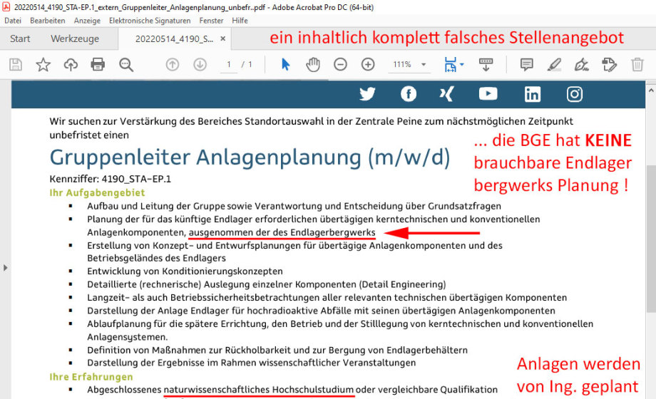 Bau-Ingenieur aber auch nichts sagen oder vorlegen konnte. - Jetzt sucht die BGE mit einer falschen Stellen-