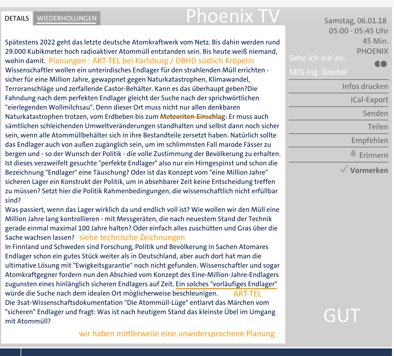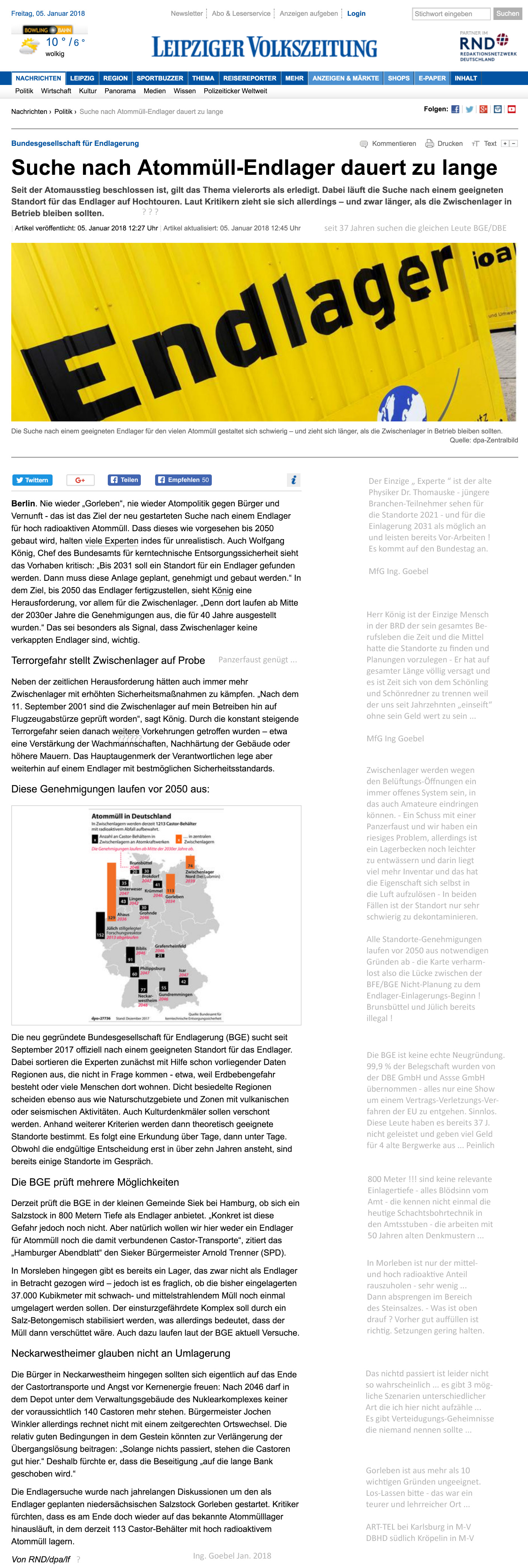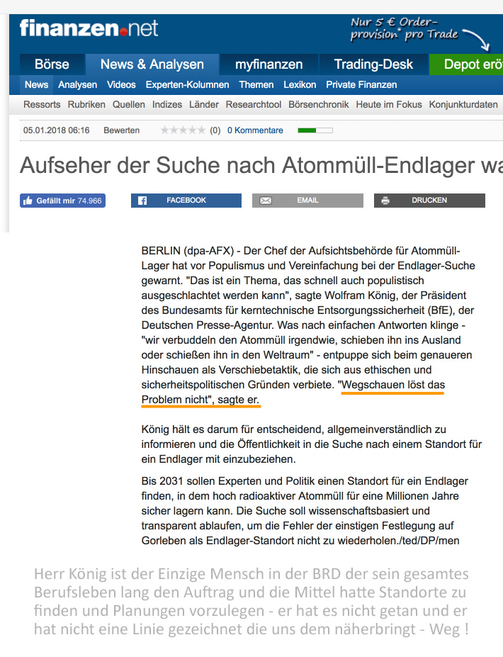 >>> Herr König (BFE/BfS) ist der Einzige Mensch in der BRD der sein gesamtes Berufsleben die Zeit, die Aufgabe, und die Mittel hatte, die 2 Standorte zu finden und die Planungen vorzulegen - Er hat auf gesamter Länge völlig versagt und es ist hohe Zeit sich von diesem Schönling und Schönredner zu trennen, weil der uns seit Jahrzehnten nur „einseift“ ohne sein Geld jemals wert gewesen zu sein ... Zeit Ing. Goebel und eine neue Generation Endlager planen und bauen zu lassen ... Schluss mit dem endlosen Behörden-Unsinn
