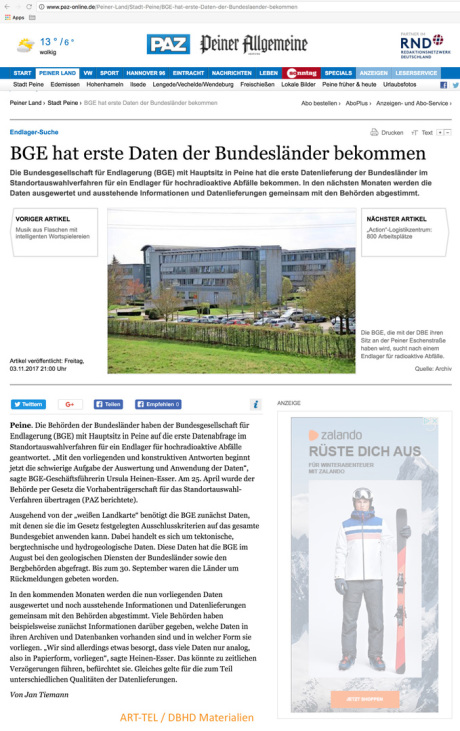 Peine. Die Behörden der Bundesländer haben der Bundesgesellschaft für Endlagerung (BGE) mit Hauptsitz in Peine auf die erste Datenabfrage im Standortauswahlverfahren für ein Endlager für hochradioaktive Abfälle geantwortet. „Mit den vorliegenden und konstruktiven Antworten beginnt jetzt die schwierige Aufgabe der Auswertung und Anwendung der Daten“, sagte BGE-Geschäftsführerin Ursula Heinen-Esser. Am 25. April wurde der Behörde per Gesetz die Vorhabenträgerschaft für das Standortauswahl-Verfahren übertragen (PAZ berichtete).