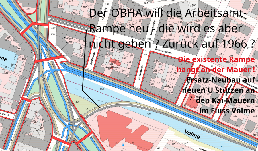 >>> Vor dem Bau der Monster-Hochbrücke für die B 54 in Hagen war da eine Strasse mit einer Stützmauer zum Fluss Volme hin. Auf diese schmale Kante wurde die Hochbrücke gebaut - und die Rampe vom Arbeitsamt hoch wurde sogar an die Mauer gehängt.