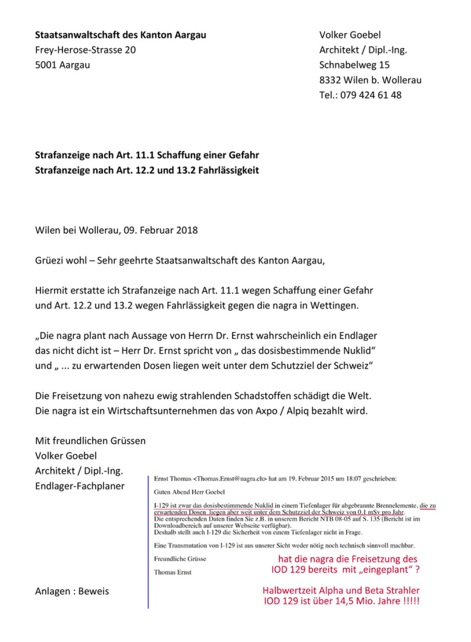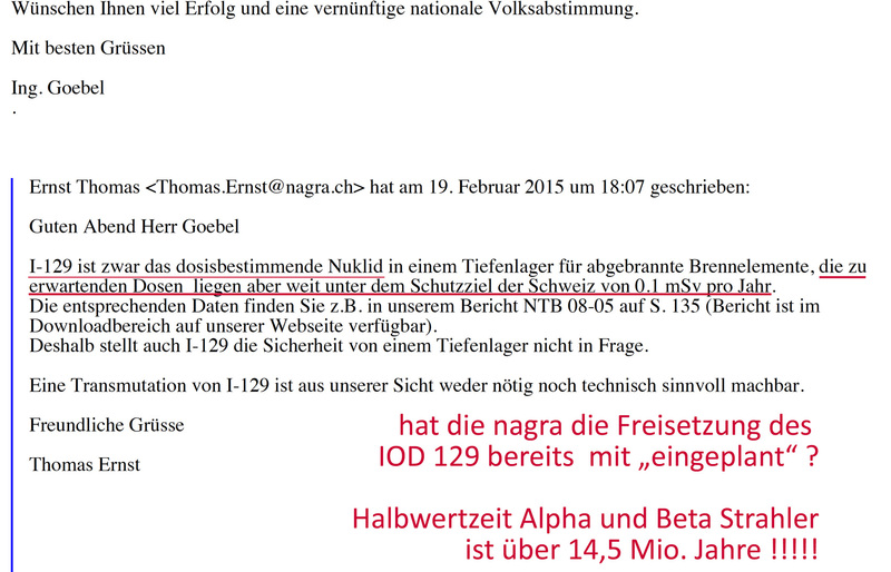 Wenn die BGE GmbH in Mitte 2020 die Karte der möglichen Endlager-Gebiete DE vorlegt ängstigen wir Hundert-Tausende von Deutschen ohne Grund ! Die untersuchte Tiefe bis -1.500 Meter ist niemals eine Endlager-Tiefe, und die Wirtsgesteine Tonstein und Granit sind wissenschaftlich nicht haltbar. Jede Menge Aufregung und zusätzliche Staats-Verdrossenheit ohne Grund ! Ein solches Verhalten aus dem Stand AG heraus ist im Vergleich mit der punktgenauen und wohl begründeten Standort-Angabe von Ing. Goebel ein Demokratie Unfall, der weit über die Gorleben Zäsur hinausgeht - Es ist Zeit Vernunft anzunehmen und von dem was WK in der Schweiz abkopiert Abstand zu nehen - Noch ist es möglich ...