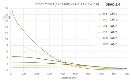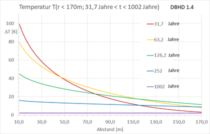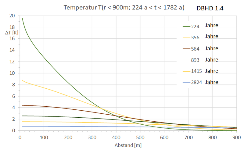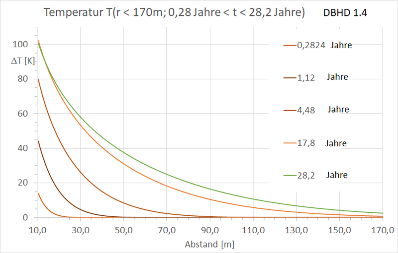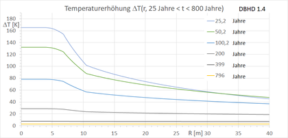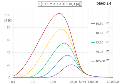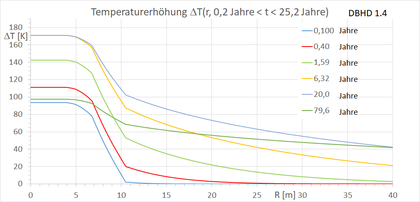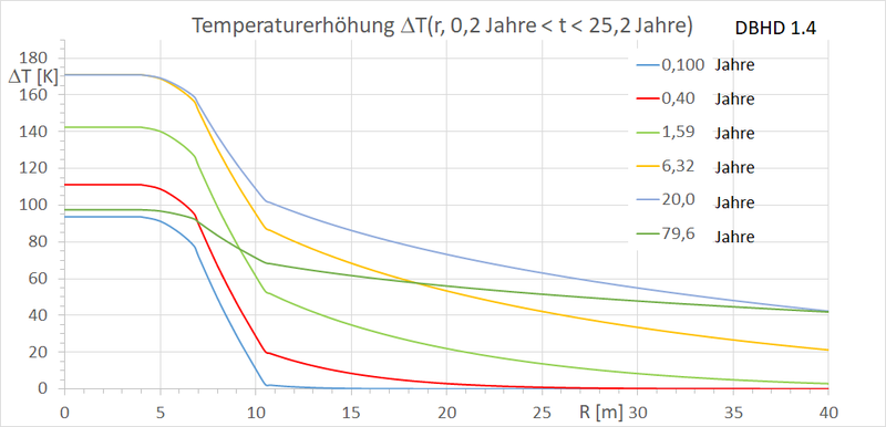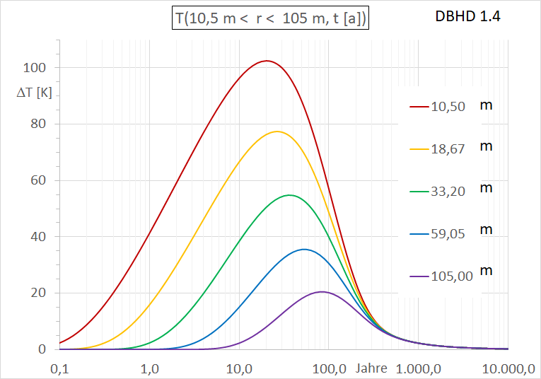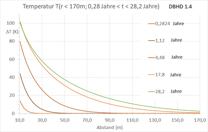 Mit der dort angegebenen Formel kann man die radiale Temperaturverteilung um die Betonpellets, die zusammen die Bohrung 740 m hoch füllen, berechnen und daraus wiederum