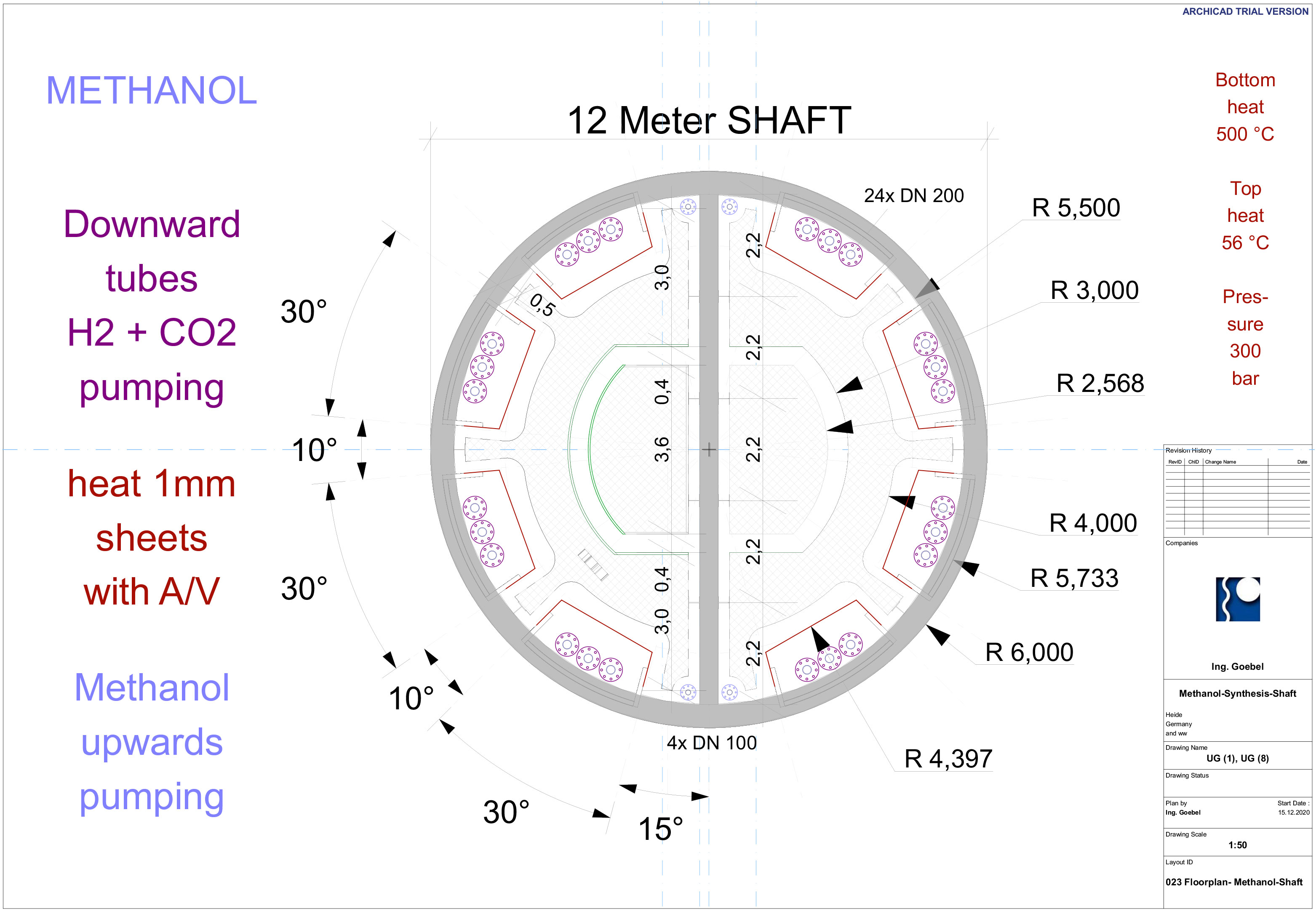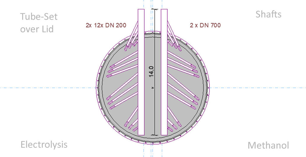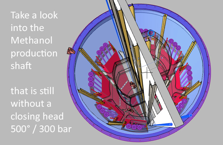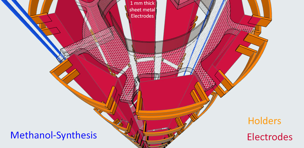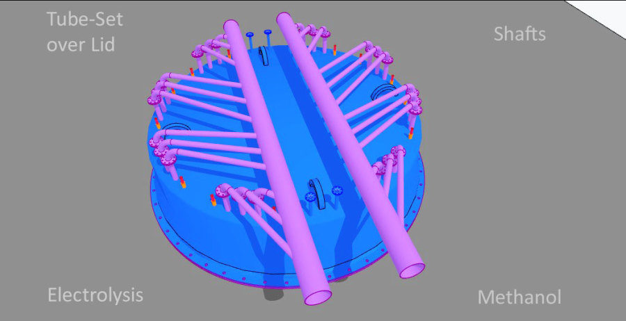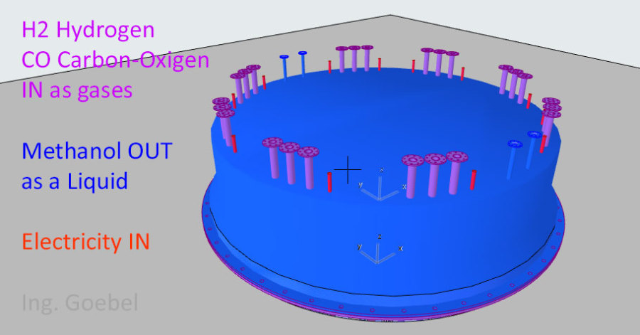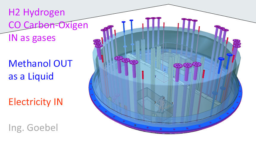 Die verwendeten Bleche auf den Anoden und Kathoden-Plätzen sind jetzt nur noch 1 mm dick und können als Widerstands-Elektro-Heizung bis 500 °C angeheizt werden - Damit wird der untere Schacht-Bereich warm und die beiden Gase können ca. 350 °C aufnehmen. - Die DN 200 Rohre in lila, es sind 12 Stück dienen zur Einleitung von H2 Wasserstoff und CO2 CO oder sogar Kohlenstaub. In dem "langen Ofen" haben die beiden Gase Zeit sich zu vermischen, aufzusteigen, zu erkalten und sich an den Wänden als Methanol niederzuschlagen. Das Methanol läuft dann aus Schwerkraft selbst nach unten wo sich erst einmal eine mächtige Methanol-Säule bildet die nach oben hin abgepumpt werden muss. Methanol ist ein Treibstoff den man tanken kann.