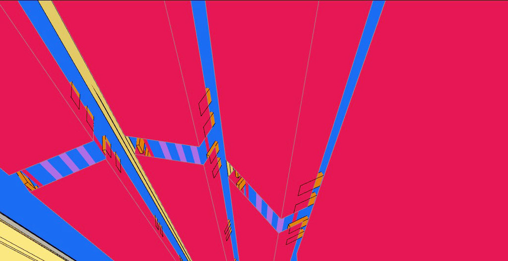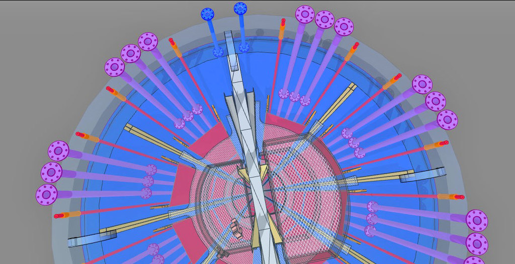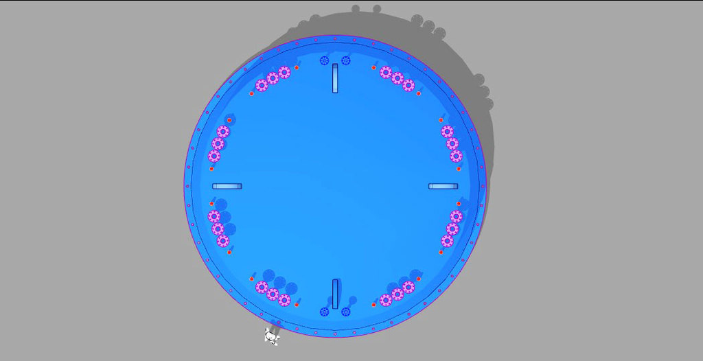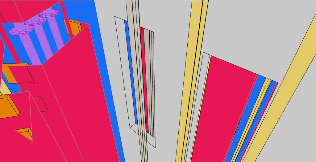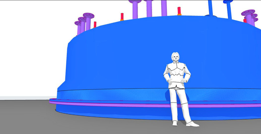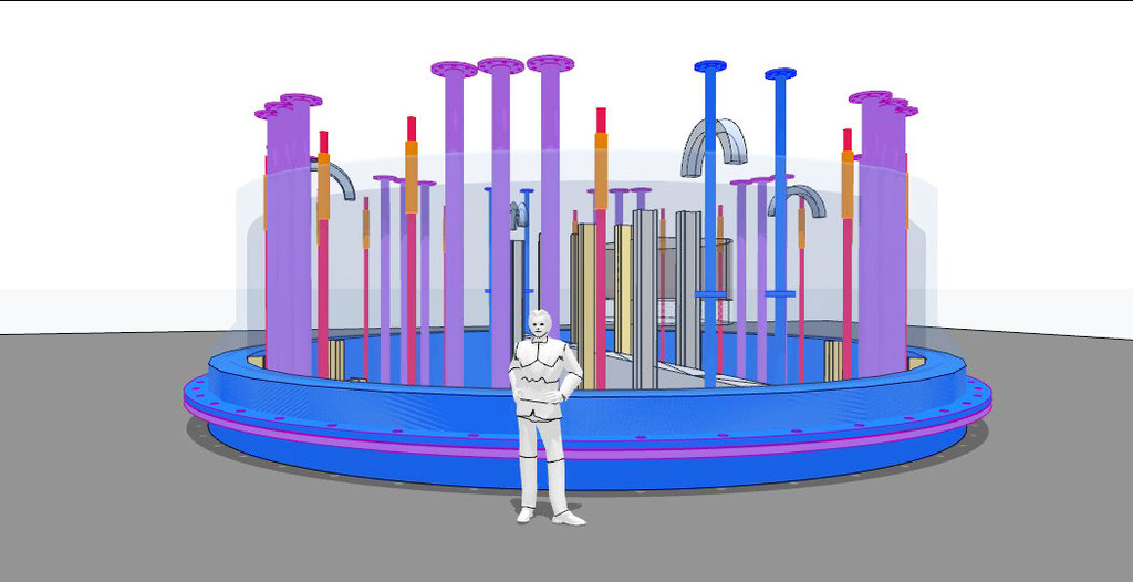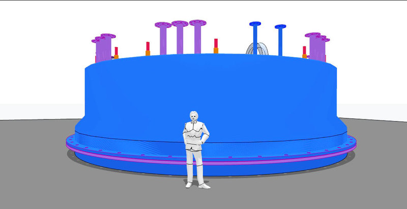 Die verwendeten Bleche auf den Anoden und Kathoden-Plätzen sind jetzt nur noch 1 mm dick und können als Widerstands-Elektro-Heizung bis 500 °C angeheizt werden - Damit wird der untere Schacht-Bereich warm und die beiden Gase können ca. 350 °C aufnehmen. - Die DN 200 Rohre in lila, es sind 12 Stück dienen zur Einleitung von H2 Wasserstoff und CO2 CO oder sogar Kohlenstaub. In dem "langen Ofen" haben die beiden Gase Zeit sich zu vermischen, aufzusteigen, zu erkalten und sich an den Wänden als Methanol niederzuschlagen. Das Methanol läuft dann aus Schwerkraft selbst nach unten wo sich erst einmal eine mächtige Methanol-Säule bildet die nach oben hin abgepumpt werden muss. Methanol ist ein Treibstoff den man tanken kann.