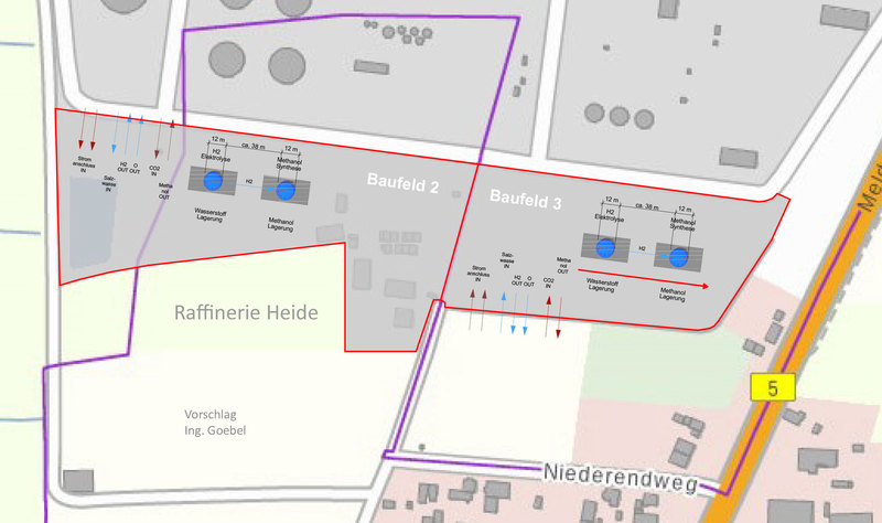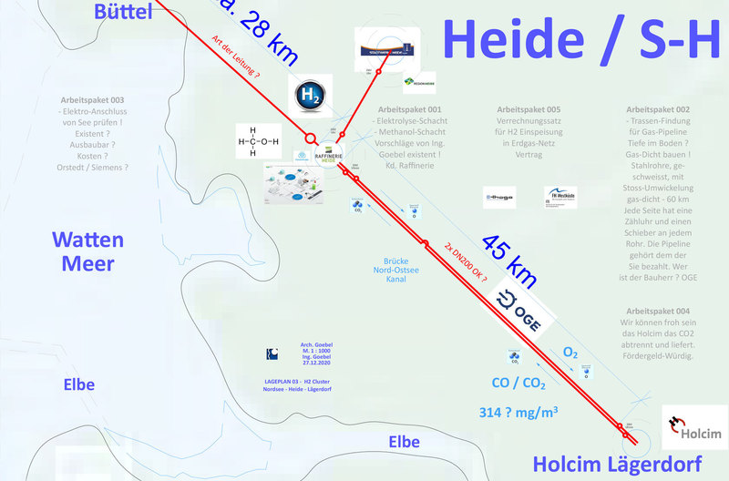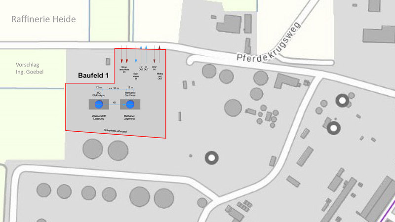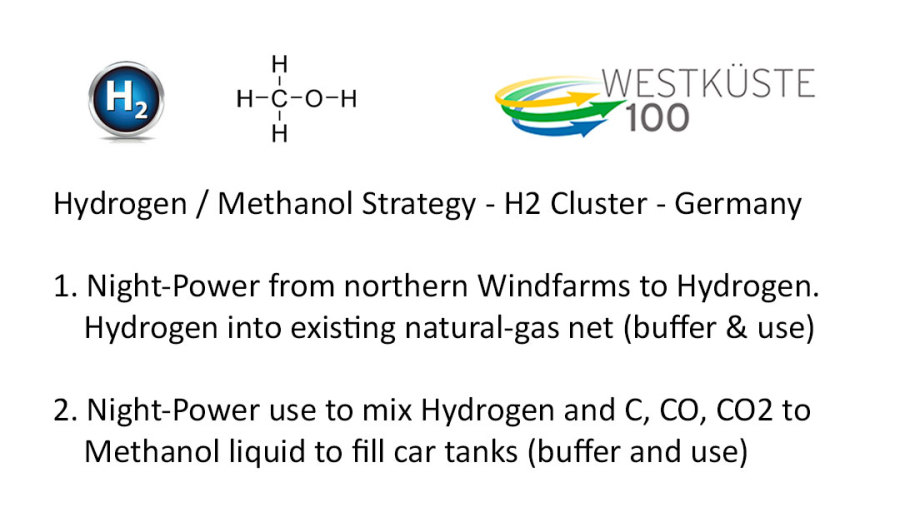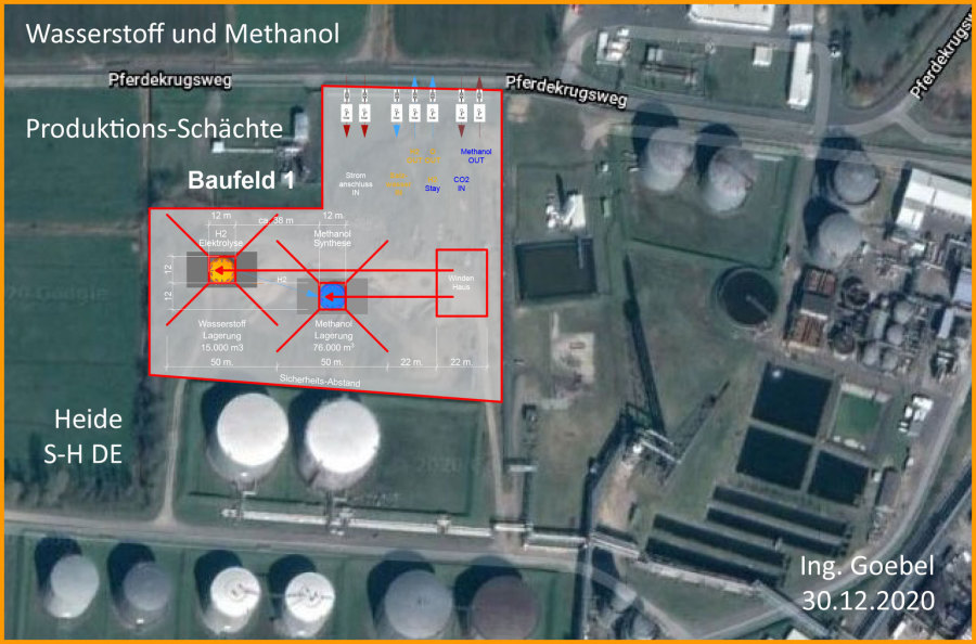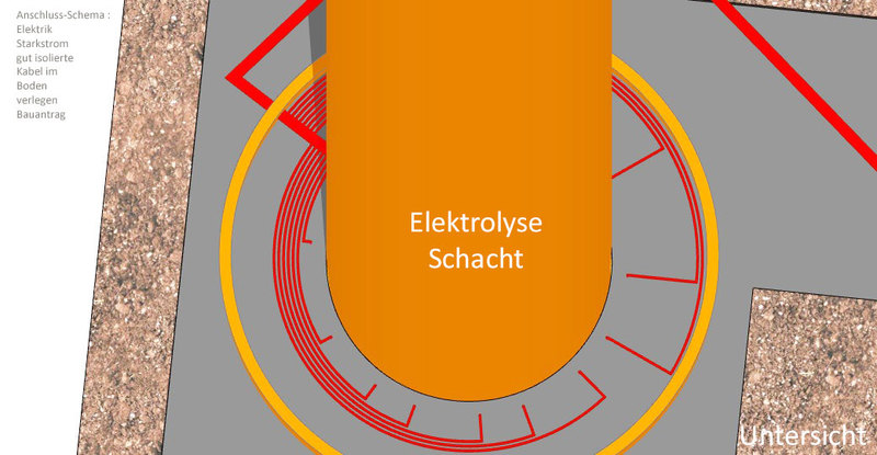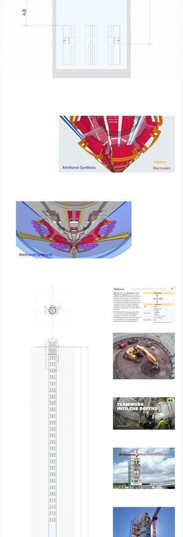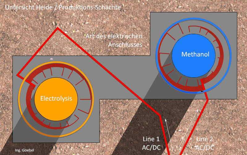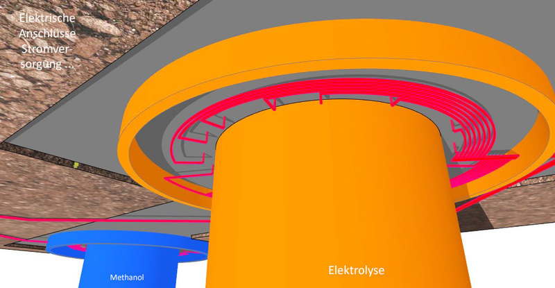 Es ist notwendig den Schacht-Ausbau so anzulegen, dass einzelne Anoden- und Kathoden-Ringe oder Segment-Bereiche einzeln elektrisch ansteuerbar sind. Ein Methanol-Ofen hat unten heiss oben kalt. Ein tiefer langer Ofen hat mehrere kleine Ofen-Bereiche vertikal übereinander. - Dem müssen die Rohre für das Befüllen mit H2 und CO2 räumlich einigermassen folgen. Das unten eine Methalnol Säule steht ist gut. Dann hat man gleich einen Lagerplatz. Man muss das flüssige Methanol aber hochpumpen um es in Tankwagen abfüllen zu können. Erst mal einen 40 Meter tiefen Schacht baggern und ausbauen und in Betrieb nehmen. Den nicht benötigten Nachtstrom von den Windmühlen für die Methanol Synthese nutzen. - Tagsüber ins Netz - Nachts ins Methanol speichern.