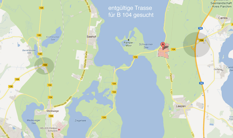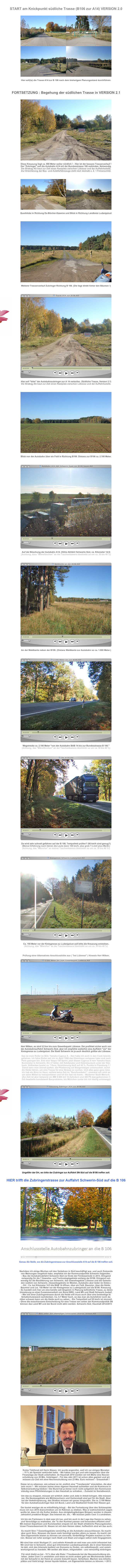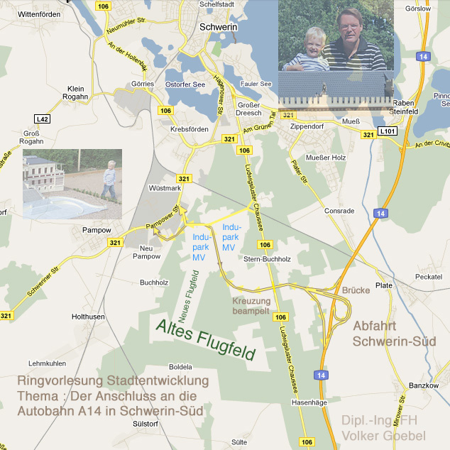 P.S.: Nachdem man uns den 4 spurigen Ausbau der B 321 zur Autobahn in Raben Steinfeld (Abf. Schwerin-Ost) gestrichen hat, sehe ich die Ausfahrt "Schwerin-Süd" vorn. - Das war ja sowieso immer schon die richtige Bau-Prioritätenabfolge. Erst die Auffahrt "Schwerin-Süd" dann den Ausbau der B 321 zur Anschlussstelle Schwerin-Ost. - Andersherum würden wir über ein Jahr einen Verkehrskollaps auf dem Weg zur Autobahn erleiden und viele Pendler dauerhaft verärgern. (Nachtrag vom 03. Jan. 2012 / Ing. Goebel)