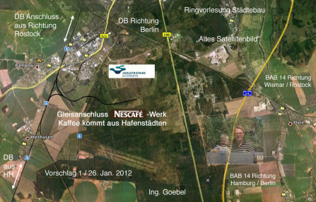 2012 - Die Planung (Musterblatt) hat sich bewährt. Der Gleisanschluss für Nestlé´s Dolce Gusto Werk muss von der DB Westtrasse her kommen. Somit ist klar, auf welcher Seite Nestlé siedeln sollte ! Damit liegt MTU an der Ludwig-Bölkow-Str. und auch direkt am Autobahnzubringer. So wie die Dinge gefallen sind kann sich BBX aussuchen, auf welchem der 9 möglichen Grundstücke sich die Logistikhalle "längs einfügen" kann. Passt alles, - der Plan vom Meister, Ing. Goebel hat gehalten und sich in der Praxis ausgesprochen gut bewährt. Bravo Schwerin.